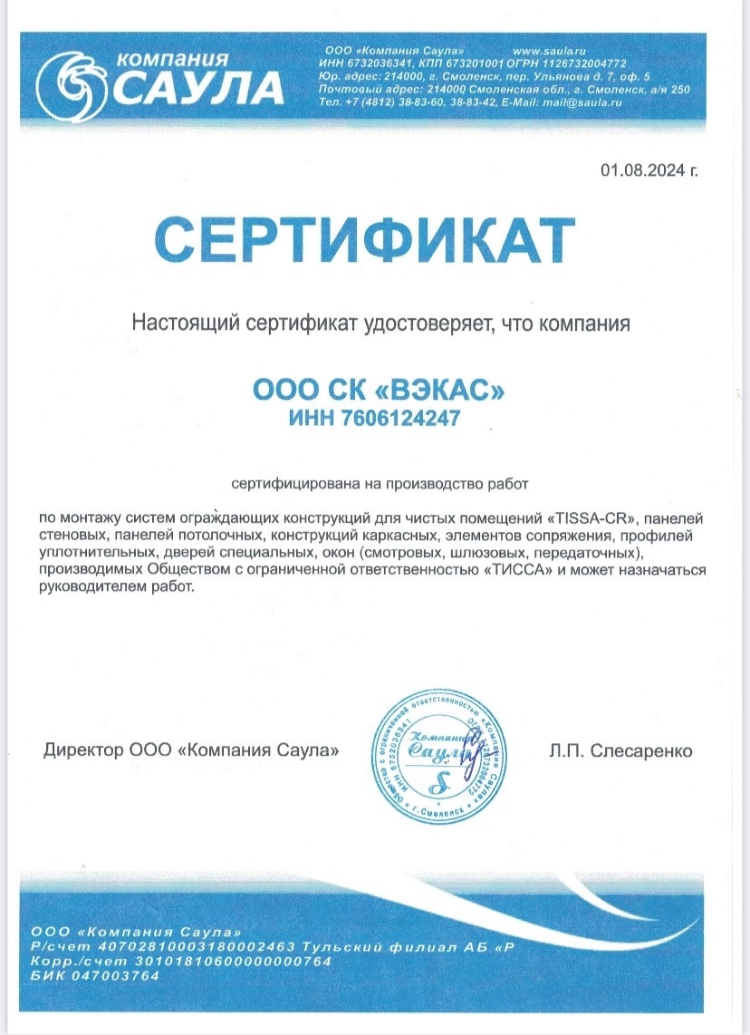 Теперь мы сертифицированы нашими партнерами, компанией «Саула», на монтаж систем ограждающих конструкций для чистых помещений производства компании «ТИССА». ООО «Компания Саула» является эксклюзивным и единственным дилером ООО «Тисса» в России. Мы гордимся тем, что наши партнеры оценили нашу работу и выбрали нас для выполнения таких ответственных задач.